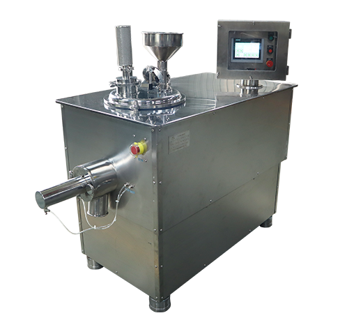 本機用于制藥工業中的固體制劑生產,集傳統制粒工藝中的混合和制粒兩道工序與一體同時進行,其制粒過程是先把粉料投入料筒內經攪拌漿形成翻滾狀態,使不同性質的粉料得到徹底的混合,然后逐量加入粘合劑。(通過攪拌漿和筒壁對物料的擠壓、揉合,使其形成潮濕均勻的軟材,同時經制粒刀片的高速切割,逐步形成大小均勻的顆粒,最后由出料口排出,顆粒目數的大小由制粒刀的轉速和制粒時間控制)。